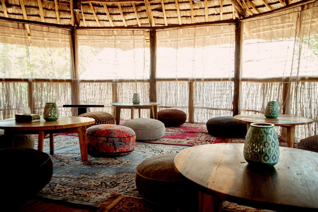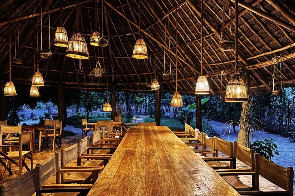 Guests can cool off in the swimming pool or unwind in garden seating areas surrounded by shade and greenery. The relaxed atmosphere continues into the dining experience, where freshly prepared meals are served using local ingredients and familiar flavors. Outdoor dining adds an extra touch, allowing guests to enjoy the natural surroundings as they eat.